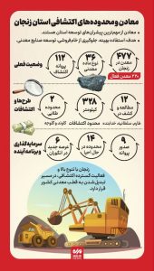 ۳۸۴ پروانه بهرهبرداری و ۴۷۴ محدوده معدنی در استان زنجان وجود دارد و بیش از ۳۶ نوع ماده معدنی استراتژیک است که سالانه حدود ۱۴.۵ میلیون تن استخراج میشود.
